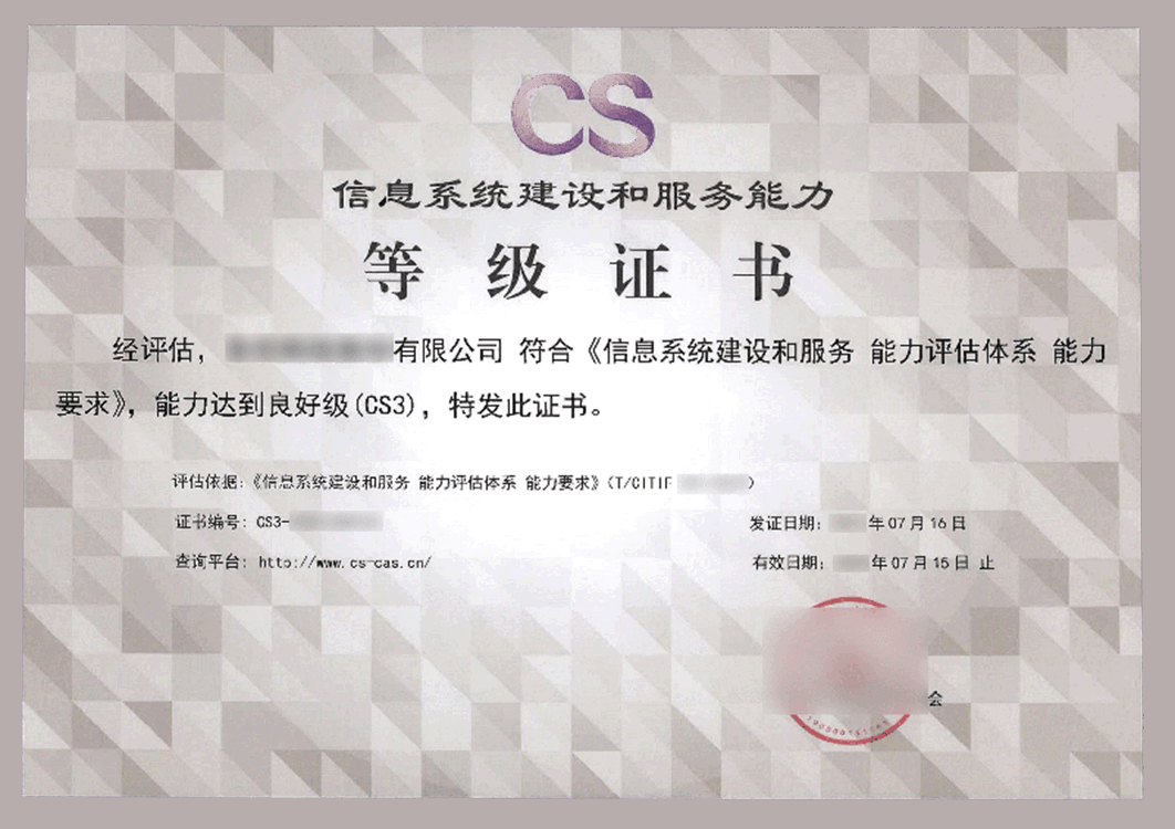信息系统建设和服务能力划分为五个等级,等级从低到高分别用CS1级(初始级)、CS2级(基本级)、CS3级(良好级)、CS4级(优秀级)、CS5级(杰出级)。