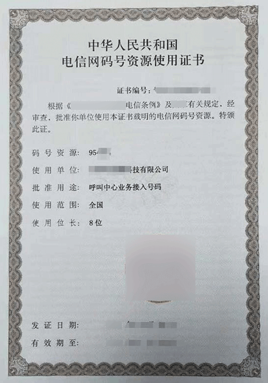 资质全称:电信网码号资源使用证书-呼叫中心业务接入号码 -